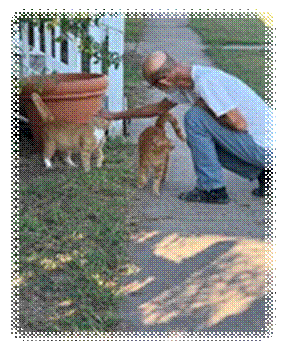 This is a story about Mike who lives right here in Burnet. He called to inquire about our Spay Neuter program. After we visited with him, we discovered that there were 22 cats in his apartment complex that needed to be spayed or neutered. With Mike’s help, we were able to trap all 22 kitties. We took them to Pet Pals in Marble Falls where they were spayed/neutered and received their rabies shots. Without Mike’s holiday spirit of helping and loving animals, this would never have happened. We visited Mike recently and he has such a sweet family of cats now. They all run out and follow him and really love him. It is very heartwarming to watch him with his cats as you can see in the picture. Thank you to Mike and all our Burnet donors who support Hill Country Cat Control and the cats of Burnet County.